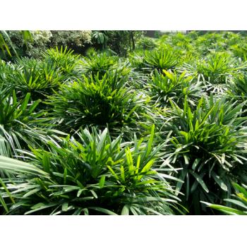 大叶棕竹 别名:筋头竹,大叶拐仔棕 拉丁名:Rhapis excelsa 科名:棕榈科棕竹属常绿灌木。原产我国的广东、广西、云南等地日本等国也有分布。 形态特征:棕竹四季常绿,成株高2~3米,茎圆柱形,有节,直径2~3厘米,不分枝,外包有褐色网状粗纤维叶鞘。叶质硬挺,集生茎顶,掌状深裂;裂片5-10枚,条状披针形,长25-30厘米,宽3-6厘米,顶端阔,有不规则齿缺,横脉多而明显,叶柄具齿刺,长15-25厘米,扁圆,叶鞘基部有黑褐网状纤维包被。 生长特性:棕竹性喜温暖、阴湿及通风良好的不环境。生长适温为20-30℃,宜排水良好、富含腐殖的砂坑口土。稍耐寒,可0℃左右的低温。 景观用途:棕竹是我国传统的阴生观叶植物,它株丛挺拔,叶青竿直,相聚成丛,扶疏有致,富有热带风韵。棕竹虽不是“竹”但却具“竹”的潇洒,纳三五枝于盆作室内陈设与厅堂布置,陡增盎然生气,春意融融。棕竹丛植点缀园林小景或假山石旁,会使环境显得格外幽静可爱,有良好的装饰效果,宜在我国南方地区栽培。幼小植株还可制作成丛林式提根盆景,配以景石,观赏效果也甚佳。