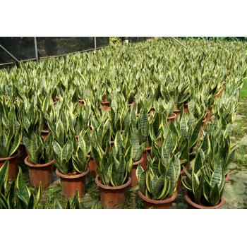 虎尾兰 中文名:虎尾兰 别名:又名虎皮兰、千岁兰、虎尾掌、锦兰等 拉丁名:Sansevieria trifasciata 科属:龙舌兰科虎尾兰属 产地:非洲热带和印度 常见的栽培品种有: 金边虎尾兰:原产刚果。叶缘具黄色镶边。 短叶虎尾兰:叶短,长15~30厘米。 习性: 多年生草本(Sansevieria)植物有60余种,原产于非洲、亚洲热带。植株高度因品种而异,从10数米至1米不等。叶肉质状,有圆筒形、剑形、广披针形等,簇生于地下根茎,叶面有各种不同形态的斑纹变化。成株每年均能开花,具香味,但以观叶为主。此类植物耐旱、耐湿、耐阴,能适应各种恶劣的环境,适合庭园美化或盆栽,为高级的花材室内植物。 栽培管理: 一般放置于阴处或半阴处,但也较喜阳光,惟有光线太强时,叶色会变暗、发白。喜欢温暖的气温。其适宜温度是18~27℃,低于13℃即停止生长。冬季温度也不能长时间低于10℃,否则植株基部会发生腐烂,造成整株死亡。 浇水要适中,不可过湿。虎尾兰为沙漠植物,能耐恶劣环境和久旱条件。浇水太勤,叶片变白,斑纹色泽也变淡。由春至秋生长旺盛,应充分浇水。冬季休眠期要控制浇水,保持土壤干燥,浇水要避免浇入叶簇内。用塑料盆或其它排水性差的装饰性花盆时,要切忌积水,以免造成腐烂而使叶片以下折倒。 施肥不应过量。生长盛期,每月可施1~2次肥,施肥量要少。长期只施氮肥,叶片上的斑纹就会变暗淡,故一般使用复合肥。也可在盆边土壤内均匀地埋3穴熟黄豆,每穴7~10粒,注意不要与根接触。从11月至第二年3月停止施肥。 对土壤要求不严,在很小的土壤体积内也能正常生长,喜疏松的沙土和腐殖土,耐干旱和瘠薄。生长很健壮,即使布满了盆也不抑制其生长。一般两年换一次盆,春季进行,可在换盆时使用标准的堆肥。 繁殖: 1、叶插繁殖:可在5~8月进行,将成熟的叶片自基部剪下,按6~10厘米一段截开,插入素沙土中,入土深度3厘米左右,插后放在疏阴下。温度保持在18~25℃,20天左右开始生根。当幼株长出2~3片叶时即可上盆。金边虎尾兰用叶插法成活后,金边常易消失,故多采用分株法繁殖。 2、分株繁殖:由于地下横生匍匐茎常露出土壤表面,所以分株时不必脱盆,直接把根茎切开,提出后上盆栽种,没有须根也能成活。当叶簇挤满全盆后,可进行脱盆,抖掉所有泥土,以一个叶簇为单位剪断根茎,分开上盆栽种,一年后可萌发出4~5个新叶簇。