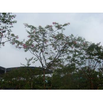 形态特征:落叶乔木,高可达10米,树身大可合抱。树皮呈长薄片状,剥落后平滑细腻。小枝略呈四棱形,常有狭翅。单叶对生或近对生,椭圆形至倒卵形,长3-7厘米,近无毛或沿北面中脉有毛,具短柄。圆锥花序着生于当年生枝端,花呈白、堇、红、紫等色,径约2.5-3厘米。花萼半球形,绿色,顶端6浅裂,花瓣6,近圆形,边缘皱缩状,基部具长爪。雄蕊多数,生于萼筒基部。子房上位。蒴果近球形,6瓣裂,径约1.2厘米,基部具宿存花萼;种子有翅。