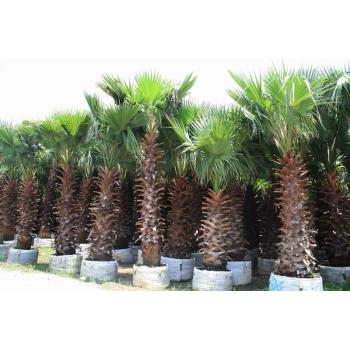 老人葵 学名:Washingtonia filifera Wendl. 拉 丁 名: Washingtonia filifera 别名:老人葵,华盛顿葵 科属:棕榈科 属:棕榈科 生态分类:木本植物常绿乔木类 观赏分类:荫木类 高度范围:20 (M) 形态特征: 其干枯的叶子下垂,覆盖于茎干,叶片间一屡屡白丝状纤维,似老翁白发. 树干粗壮通直,近基部略膨大。树冠以下被以垂下的枯叶。叶簇生干顶,斜上或水平伸展,下方的下垂,灰绿色,掌状中裂,圆形或扇形折叠,边缘具有白色丝状纤维。肉穗花序,多分枝。花小,白色。核果椭圆形,熟时黑色。花期6-8月。 生长习性: 喜温暖、湿润、向阳的环境。较耐寒,在-5度的短暂低温下,不会造成冻害。较耐旱和耐瘠薄土壤。不宜在高温、高湿处栽培。 景观用途: 是美丽的风景树,干枯的叶子下垂覆盖于茎干似裙子,有人称之为“穿裙子树”,奇特有趣;叶裂片间具有白色纤维丝,似老翁的白发,又名“老人葵”。宜栽植于庭园观赏,也可作行道树。 这是棕榈科植物中较耐寒的种类之一,可耐-6℃的低温,抗风抗旱力均很强,生长迅速,树干直而挺拔,基部显著膨大,,粗壮而呈红褐色的树干格外引人注目