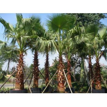 老人葵  学名:Washingtonia filifera Wendl.   拉 丁 名: Washingtonia filifera   别名:老人葵,华盛顿葵   科属:棕榈科   属:棕榈科   生态分类:木本植物常绿乔木类   观赏分类:荫木类   高度范围:20 (M)    形态特征:   其干枯的叶子下垂,覆盖于茎干,叶片间一屡屡白丝状纤维,似老翁白发.   树干粗壮通直,近基部略膨大。树冠以下被以垂下的枯叶。叶簇生干顶,斜上或水平伸展,下方的下垂,灰绿色,掌状中裂,圆形或扇形折叠,边缘具有白色丝状纤维。肉穗花序,多分枝。花小,白色。核果椭圆形,熟时黑色。花期6-8月。   生长习性:   喜温暖、湿润、向阳的环境。较耐寒,在-5度的短暂低温下,不会造成冻害。较耐旱和耐瘠薄土壤。不宜在高温、高湿处栽培。   景观用途:   是美丽的风景树,干枯的叶子下垂覆盖于茎干似裙子,有人称之为“穿裙子树”,奇特有趣;叶裂片间具有白色纤维丝,似老翁的白发,又名“老人葵”。宜栽植于庭园观赏,也可作行道树。   这是棕榈科植物中较耐寒的种类之一,可耐-6℃的低温,抗风抗旱力均很强,生长迅速,树干直而挺拔,基部显著膨大,,粗壮而呈红褐色的树干格外引人注目。   成年树高大雄伟,最高可达20m,头径50-90cm,树冠优美,叶大如扇,四季常青。掌状叶裂片间在幼时具白色的卷曲的丝状纤维, 能给人一种遐想万缕的感受。此品种遍植于美国加州的公路旁,差不多成为加州马路树的标志,有人称之为加州蒲葵,在公路两旁,由华盛顿葵构成的美丽景观会给驾乘人员一种愉悦的视觉享受,足以消除旅途疲劳。除了作为道路绿化树种外,被大量应用为园景树、行道树,或装点于立交桥畔、别墅宾馆。在公园、广场、河滨等较宽阔地带,孤植或群植,营造出绮丽多姿的热带、亚热带风光。   目前有几个房地产楼盘栽种上华盛顿葵后很有特色,提高了整个楼盘的景观档次,成都府南河畔种了大遍华盛顿葵表现良好,很受群众喜爱。四川温江荣星棕榈园有各种规格的华盛顿葵近两万株,从近六年的生长情况来看,表现优良,形状美观。成年华盛顿葵的叶裙长达10多米,能给人历尽沧桑、万古长青之感。作为绿化苗木生产,华盛顿葵极具市场潜力,它是目前绿化苗木中增值最快的树种之一。   适应地区:   华南南亚热带常绿阔叶林区(主要城市:福州、厦门、泉州、漳州、广州、佛山、顺德 、东莞 、惠州、汕头、台北、柳州、桂平、个旧)   热带季雨林及雨林区(主要城市:海口、三亚、琼海、高雄、台南、深圳、湛江、中山、珠海、澳门、香港、南宁、钦州 北海、茂名、景洪)