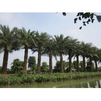 中东海枣别名:银海枣,科名:棕榈科刺葵属,学名:Phoenix sylvestris,原产地:印度、缅甸。生活环境:是一种耐高温、耐水淹、耐干旱、耐盐碱、耐霜冻(能抵抗-10℃的严寒,除东北和大西北冬天极严寒地域外),喜阳光,可在热带至亚热带气候下种植的棕榈科植物。栽培土壤要求不严,但以土质肥沃、排水良好的有机壤土最佳。银海枣生长快速, 各地均能引种,也是优良的室内植物。形态特征:银海枣植株高大雄伟,形态优美,树干粗壮,叶顶丛生,羽片密而伸展,大型羽状叶片向四方开张,形态如苏铁,使其成为最具观赏价值的羽状叶棕榈植物。干上残余叶柄伏贴干上,高可达10公尺,径为30公分,褐色,残余叶柄灰褐色,无叶鞘假茎,叶柄基部的棕蓑少少复叶基部的小叶变成针刺,羽状复叶较密,长约2-3公尺,果实指头大小。用途:可孤植作景观树,或列植为行道树,也可三五群植造景,相当壮观,是充满贵族派的棕榈植物。应用于住宅小区、道路绿化,庭院、公园造景等效果极佳,为优美的热带风光树。