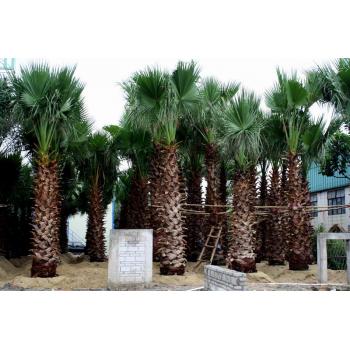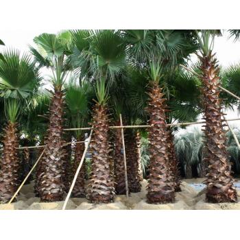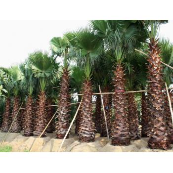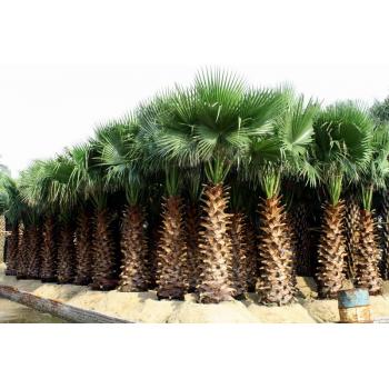 老人葵,别名:华棕,华盛顿葵。 生态分类:常绿棕榈科植物。 观赏分类:荫木类。 高度范围:20 (M)。 形态特征:其干枯的叶子下垂,覆盖于茎干,叶片间一屡屡白丝状纤维,似老翁白发. 树干粗壮通直,近基部略膨大。树冠以下被以垂下的枯叶。叶簇生干顶,斜上或水平伸展,下方的下垂,灰绿色,掌状中裂,圆形或扇形折叠,边缘具有白色丝状纤维。肉穗花序,多分枝。花小,白色。核果椭圆形,熟时黑色。花期6-8月。 生长习性:喜温暖、湿润、向阳的环境。较耐寒,在-5度的短暂低温下,不会造成冻害。较耐旱和耐瘠薄土壤。不宜在高温、高湿处栽培。 景观用途:是美丽的风景树,干枯的叶子下垂覆盖于茎干似裙子,有人称之为“穿裙子树”,奇特有趣;叶裂片间具有白色纤维丝,似老翁的白发,又名“老人葵”。宜栽植于庭园观赏,也可作行道树。 这是棕榈科植物中较耐寒的种类之一,可耐-6℃的低温,抗风抗旱力均很强,生长迅速,树干直而挺拔,基部显著膨大,,粗壮而呈红褐色的树干格外引人注目。成年树高大雄伟,最高可达20m,头径50-90cm,树冠优美,叶大如扇,四季常青。掌状叶裂片间在幼时具白色的卷曲的丝状纤维, 能给人一种遐想万缕的感受。此品种遍植于美国加州的公路旁,差不多成为加州马路树的标志,有人称之为加州蒲葵,在公路两旁,由华盛顿葵构成的美丽景观会给驾乘人员一种愉悦的视觉享受,足以消除旅途疲劳。除了作为道路绿化树种外,被大量应用为园景树、行道树,或装点于立交桥畔、别墅宾馆。在公园、广场、河滨等较宽阔地带,孤植或群植,营造出绮丽多姿的热带、亚热带风光。 目前有几个房地产楼盘栽种上华盛顿葵后很有特色,提高了整个楼盘的景观档次,成都府南河畔种了大遍华盛顿葵表现良好,很受群众喜爱。四川温江荣星棕榈园有各种规格的华盛顿葵近两万株,从近六年的生长情况来看,表现优良,形状美观。成年华盛顿葵的叶裙长达10多米,能给人历尽沧桑、万古长青之感。作为绿化苗木生产,华盛顿葵极具市场潜力,它是目前绿化苗木中增值最快的树种之一。