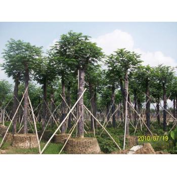 南洋楹 拉丁名:Albizia falcataria (L.) Fosberg 别名仁仁树, 属含羞草科、合欢属 产地分布:原产印度尼西亚东北部的马鲁古群岛,中国福建、广东、海南等地有栽培。 形态特征:为乔木,树干通直,树冠稀疏,嫩树淡绿色,微有棱。二回羽状复叶,羽片11~20对,每羽具小叶18~20对,对生,矩圆形,穗状花序腋生,花冠淡蓝色。 生长习性:阳性树种,不耐阴,喜暖热多雨气候及肥沃湿润土壤。幼根瘤菌,具固氮作用。花期7~8月。 园林用途:南洋楹生长迅速,树形美观,可作庭园绿荫树种栽植,也是良好的经济林木。 繁殖培育:播种法繁殖。种子外皮具蜡质,播前应用沸水将其除去,冷却后播种,可使发芽率提高,且出苗整齐。苗高30cm左右即可定植,定植后进行一般管理。