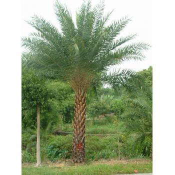 中东海枣 别名:银海枣 科名:棕榈科刺葵属 学名:Phoenix sylvestris 原产地:印度、缅甸 生活环境:是一种耐高温、耐水淹、耐干旱、耐盐碱、耐霜冻(能抵抗-10℃的严寒,除东北和大西北冬天极严寒地域外),喜阳光,可在热带至亚热带气候下种植的棕榈科植物。栽培土壤要求不严,但以土质肥沃、排水良好的有机壤土最佳。银海枣生长快速, 各地均能引种,也是优良的室内植物。 形态特征:银海枣植株高大雄伟,形态优美,树干粗壮,叶顶丛生,羽片密而伸展,大型羽状叶片向四方开张,形态如苏铁,使其成为最具观赏价值的羽状叶棕榈植物。干上残余叶柄伏贴干上,高可达10公尺,径为30公分,褐色,残余叶柄灰褐色,无叶鞘假茎,叶柄基部的棕蓑少少复叶基部的小叶变成针刺,羽状复叶较密,长约2-3公尺,果实指头大小。 用途:可孤植作景观树,或列植为行道树,也可三五群植造景,相当壮观,是充满贵族派的棕榈植物。应用于住宅小区、道路绿化,庭院、公园造景等效果极佳,为优美的热带风光树。