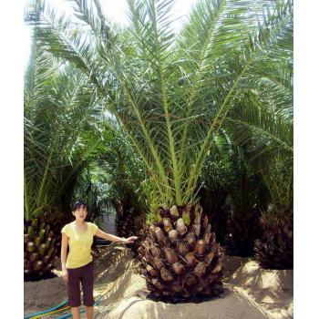 加拿利海枣,别名:长叶刺葵、加拿利刺葵、槟榔竹 【形态特征】常绿乔木,高可达10~15米,粗20~30厘米。干单生,其上覆以不规则的老叶柄基部。叶大型,长可达4~6米,呈弓状弯曲,集生于茎端。羽状复叶,成树叶片的小 叶有150~200对,形窄而刚直,端尖,上部小叶不等距对生,中部小叶等距对生,下部小叶每2~3片簇生,基部小叶成针刺状。叶柄短,基部肥厚,黄褐色。叶柄基部的叶鞘残存在干茎上,形成稀疏的纤维状棕片。5~7月开花,肉穗花序从叶间抽出,多分枝。果期8~9月,果实卵状球形,先端微突,成熟时橙黄色,有光泽。种子椭圆形,中央具深沟,灰褐色。 【园林用途】加拿利海枣富有热带风韵,其树形优美舒展,茎干胸径常达50cm以上,具紧密排列的扁菱形叶痕而较为平整;叶绿壮旺,羽片坚韧;树形张开呈半圆形,远观如同撑开了的罗伞,富有热带风情,可盆栽作室内布置,也可室外露地栽植,无论行列种植或丛植,都有很好的观赏效果。应用于公园造景、行道绿化,效果极好。其成龄树能耐零下10低温,为棕榈科植物中耐寒能力最强的品种之一。该树种虽原产于海岛,也非常适应内陆气候。寒性也较强,可在热带至亚热带气候条件下种植。其球形树冠、金黄色的果穗、菱形叶痕、粗壮茎干以及长长的羽状叶极具观赏价值,目前在我国长江流域及以南地区用于园林绿化,特别是上海、重庆、长沙等地,常用其营造热带风景。 【移植管理】移植时,土坑要大于先有的土球,一般为高1.5M,宽2M。底部放一层碎砖,上面再铺一层细砂后再种植。种植时底部要撒‘呋喃丹’或石粉。以防地虫。其它部位以含腐植之壤土或砂质土壤种植,即保湿排水好。一般树定植后,土球要高出土表5-10CM,使之与土表成45度角倾斜。以细砂覆盖,上部最好种上细小的植物,有保护水土流失作用。 【适应性】 1)气候环境 加拿利海枣原产非洲西岸的加拿利岛,我国热带至亚热带地区可露地栽培,在长江流域冬季需稍加遮盖,黄淮地区则需室内保温越冬。其植株耐热、耐寒性均较强,成龄树能耐受-10℃低温。 2)生态适应性 加拿利海枣为常绿乔木。喜温暖湿润的环境,喜光又耐阴。一年生小苗适应较荫蔽环境,一般遮阴50%为佳。成龄树适应阳光充足的环境。 有资料显示,加拿利海枣能耐零下10℃的低温,但尚需证实。目前建议在冬季最低温零下5℃以上的地区推广。 在土壤适应性方面,只要不积水,几乎各种土壤包括偏盐碱性土壤都能生长。 喜强光照,不耐阴,耐高温、干旱,也能抗一定程度的污染。 它凭借特有的浓郁的亚热带植物特色,成为高档造景树种之一。 加拿利海枣是世界上著名的一种高级风景树,树形高大、壮观、优美、叶片翠绿有光泽。树干单一、直立,高度可达10---15米,杆径粗为50--90厘米。叶,羽状,顶生,从出,向四方展开,可形成直径6--8米的圆形树冠。原产非洲西岸的加拿利海岛。我国厦门植物园最先从国外引进,引种近40年来,表现良好。厦门植物园的棕榈岛,景观迷人,是该园景观最为秀丽之处。 加拿利海枣生性强健,既耐高温,又耐霜冻;既耐干旱,又耐水淹;既耐酸性,又耐碱性土壤。PH5---PH8.3的土壤中均可正常生长,还及其抗风,是优秀的海滨植物。美中不足的是,要预防感染钻心虫,红棕象甲和椰心椰甲(防治方法见加拿利海枣的病虫害防治)。 加拿利海枣作为一种国外引进的高档风景树已得到国内许多园林单位的认可和广大市民的喜爱。由于这个品种的大树(杆高2—7米)均为国外引进,价格昂贵,杆高1米约为16000-20000元/米,以树杆6米为例,单株的成本已为十几万,加上,运费种植养护费及死亡率分摊,已移栽成活的树,平均每株价值在20万左右,所以一般在长江以南的高档的房地产小区,私人豪华别墅和标志性的市政工程上才有使用。如:上海的延中绿地、人们广场、世纪广场、常州步行街、萧山花木城、东莞的政府广场、昆明世博园、厦门机场等地。都能看到这种优美壮观的植物。