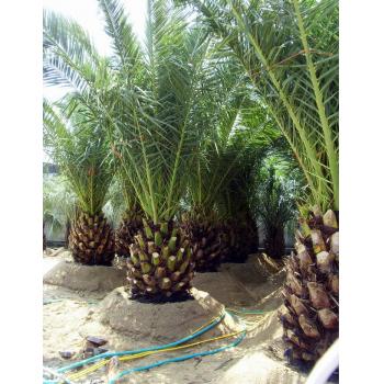 加拿利海枣,别名:长叶刺葵、加拿利刺葵、槟榔竹 【形态特征】常绿乔木,高可达10~15米,粗20~30厘米。干单生,其上覆以不规则的老叶柄基部。叶大型,长可达4~6米,呈弓状弯曲,集生于茎端。羽状复叶,成树叶片的小 叶有150~200对,形窄而刚直,端尖,上部小叶不等距对生,中部小叶等距对生,下部小叶每2~3片簇生,基部小叶成针刺状。叶柄短,基部肥厚,黄褐色。叶柄基部的叶鞘残存在干茎上,形成稀疏的纤维状棕片。5~7月开花,肉穗花序从叶间抽出,多分枝。果期8~9月,果实卵状球形,先端微突,成熟时橙黄色,有光泽。种子椭圆形,中央具深沟,灰褐色。 【园林用途】加拿利海枣富有热带风韵,其树形优美舒展,茎干胸径常达50cm以上,具紧密排列的扁菱形叶痕而较为平整;叶绿壮旺,羽片坚韧;树形张开呈半圆形,远观如同撑开了的罗伞,富有热带风情,可盆栽作室内布置,也可室外露地栽植,无论行列种植或丛植,都有很好的观赏效果。应用于公园造景、行道绿化,效果极好。其成龄树能耐零下10低温,为棕榈科植物中耐寒能力最强的品种之一。该树种虽原产于海岛,也非常适应内陆气候。寒性也较强,可在热带至亚热带气候条件下种植。其球形树冠、金黄色的果穗、菱形叶痕、粗壮茎干以及长长的羽状叶极具观赏价值,目前在我国长江流域及以南地区用于园林绿化,特别是上海、重庆、长沙等地,常用其营造热带风景。 【移植管理】移植时,土坑要大于先有的土球,一般为高1.5M,宽2M。底部放一层碎砖,上面再铺一层细砂后再种植。种植时底部要撒‘呋喃丹’或石粉。以防地虫。其它部位以含腐植之壤土或砂质土壤种植,即保湿排水好。一般树定植后,土球要高出土表5-10CM,使之与土表成45度角倾斜。以细砂覆盖,上部最好种上细小的植物,有保护水土流失作用。 【适应性】 1)气候环境 加拿利海枣原产非洲西岸的加拿利岛,我国热带至亚热带地区可露地栽培,在长江流域冬季需稍加遮盖,黄淮地区则需室内保温越冬。其植株耐热、耐寒性均较强,成龄树能耐受-10℃低温。 2)生态适应性 加拿利海枣为常绿乔木。喜温暖湿润的环境,喜光又耐阴。一年生小苗适应较荫蔽环境,一般遮阴50%为佳。成龄树适应阳光充足的环境。 有资料显示,加拿利海枣能耐零下10℃的低温,但尚需证实。目前建议在冬季最低温零下5℃以上的地区推广。 在土壤适应性方面,只要不积水,几乎各种土壤包括偏盐碱性土壤都能生长。 喜强光照,不耐阴,耐高温、干旱,也能抗一定程度的污染。 它凭借特有的浓郁的亚热带植物特色,成为高档造景树种之一。 加拿利海枣是世界上著名的一种高级风景树,树形高大、壮观、优美、叶片翠绿有光泽。树干单一、直立,高度可达10---15米,杆径粗为50--90厘米。叶,羽状,顶生,从出,向四方展开,可形成直径6--8米的圆形树冠。原产非洲西岸的加拿利海岛。我国厦门植物园最先从国外引进,引种近40年来,表现良好。厦门植物园的棕榈岛,景观迷人,是该园景观最为秀丽之处。 加拿利海枣生性强健,既耐高温,又耐霜冻;既耐干旱,又耐水淹;既耐酸性,又耐碱性土壤。PH5---PH8.3的土壤中均可正常生长,还及其抗风,是优秀的海滨植物。美中不足的是,要预防感染钻心虫,红棕象甲和椰心椰甲(防治方法见加拿利海枣的病虫害防治)。 加拿利海枣作为一种国外引进的高档风景树已得到国内许多园林单位的认可和广大市民的喜爱。由于这个品种的大树(杆高2—7米)均为国外引进,价格昂贵,杆高1米约为16000-20000元/米,以树杆6米为例,单株的成本已为十几万,加上,运费种植养护费及死亡率分摊,已移栽成活的树,平均每株价值在20万左右,所以一般在长江以南的高档的房地产小区,私人豪华别墅和标志性的市政工程上才有使用。如:上海的延中绿地、人们广场、世纪广场、常州步行街、萧山花木城、东莞的政府广场、昆明世博园、厦门机场等地。都能看到这种优美壮观的植物。