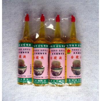 品名:金琥液(多肉植物专用营养液) 包装:每支120ml,每排4支,每箱20排。 功能特点:采用多肉植物的专用配方。满足金琥等多肉植物的灌桨的特殊营养需求。 能促进生长加快生长循环,增强抗病力,防治病虫害。 适应:多肉植物