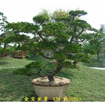 真柏 属柏科,圆柏属。常绿灌木,枝干常屈曲匍匐,小枝上升作密丛状。刺形叶细短,通常交互对生或3叶轮生,长3~6毫米,紧密排列,微斜展。球果圆形,带蓝绿色。 主要栽培品种 1.密生偃柏,植株分枝紧密,鳞形叶淡绿色,刺形叶暗绿色,顶端粉绿色。 2.粉羽偃柏,植株矮生,小枝细瘦,略呈羽状,叶有白粉。落千丈3.淡绿偃柏,植株矮小,小枝紧密丛生,叶淡绿色。 分布于我国东北张广才岭,海拔1400米山地。苏联、日本也有分布。日本称\"槙柏\",学名Juniperus chinensisvar.Sargentii Henry。 喜光,略耐荫,耐寒性强,亦耐瘠薄,能生于岩石缝中;对土壤要求不严,中性土、石灰性土均能适应。但以肥沃、深厚及含腐殖质丰富的土壤最宜。 (二)取材与培育措施 人工繁殖:真柏通常以扦插或压条法繁殖。插穗以一年生嫩枝为佳,穗长10~15厘米,剪去中部以下小枝,插深1B2;苗床用腐叶土掺拌沙土,宜肥沃疏松、排水良好。插后浇透水,随时搭棚遮荫,2~3月后即可生根。次年春季进行分栽移植,培育大苗。真柏常匍匐地面生长,不定根随之发生,故亦可以压条法繁殖。用扁柏或侧柏苗作砧木行嫁接繁殖,也易成活。 (三)上盆过程 选盆:真柏宜用紫砂陶盆,大型盆景亦可用凿石盆。盆的形状以中深的长方形、椭圆形、正方形、圆形、六角形等为宜;悬崖式可用深千筒盆。 用土:真柏宜用肥沃疏松的中性土或石灰性土。盆栽常用腐殖土掺木炭屑或拌沙混合使用。 栽种:宜在春季3~4月进行,秋季亦可。栽种时要注意在盆孔处用瓦片垫空,以利透水。上盆栽种后,第一次水应浇足,以后稍干再浇。 (四)整姿 技术加工:真柏的造型加工以攀扎为主,修剪为辅。一般以金属丝攀扎较方便,伸屈自如,线条流畅,并可将枝干进行扭旋,以显示古柏之雅趣。攀扎时重点将主要枝干造型扎好,小枝可攀扎也可修剪。 真柏的局部枝干可以作成枯枝、枯干,即所谓\"舍利干\",模仿自然界树木因长期遭受风雨雷电袭击,而形成某些枝干劈断,树皮剥落的现象,从而产生古雅奇特的效果。制作时,可先选定某些枝干(常常利用本来不需要的枝干),剪除小枝叶,从基部起剥除树皮,可用刀削,也可用手指剥。枝梢处须削成自然断折状,力求不露出人工痕迹。最后在剥去树皮的枝干上涂以石灰硫磺合剂,以防止腐朽。\"舍利干\"的位置安排很重要,它对整株柏树造型起着调节疏密虚实和增加对比变化的作用,故须仔细斟酌。\"舍利干\"可在树木的顶端,也可在枝干的中部,根据造型需要而定。 树形:自然界生长的古柏往往呈虬曲状,真柏的树形也可制作成曲干式,其次为悬崖式、斜干式和卧干式。曲干式的主干须曲折多变,特别须注意弯曲的方向和弯曲的程度的变化。悬崖式、斜干式和卧干式的主干也不可太直,而宜带几分弯曲。 真柏的枝叶宜作成团簇状,并可适当下垂。此外,真柏的局部枝干还可制作成\"舍利干\"。