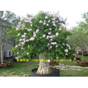大叶紫薇,别名:大花紫薇、洋紫薇、痒痒树 原产地:原产亚洲热带地区;我国广东、广西、湖南、湖北、福建、江西、浙江、河南、河北、山东、安徽、陕西、四川、云南、贵州及吉林均有生长和栽培。 形态特征:落叶小乔木。树高6-12(15)米,干直立,树皮黑褐色,分枝多,枝开展,圆伞形。叶大,长10-70厘米,有短柄。单叶对生,椭圆形、长卵形至长椭圆形,长可达20厘米,先端锐,全缘;5-8月开花,圆锥花序顶生,花紫色,花形大,径5-7公分,6片淡紫色花瓣,边缘呈不齐波状;蒴果圆球形,径约2.5厘米,秋季成熟,成熟时茶褐色,自裂成六片。花萼有棱糟及鳞片状柔毛;夏秋开花。 生长习性:阳性植物。需强光。耐热、不耐寒、耐旱、耐碱、耐风、耐半荫、耐剪、抗污染、大树较难移植。喜高温湿润气候,栽培在全日照或半日照之地均能适应,对土壤选择不严,抗风,耐寒,耐干旱和耐瘠薄。 繁殖方法:播种、扦插、高枝压条均可。于春季新叶萌发前取枝扦插,成活率甚高。 观赏评价: 1、枝叶茂密,开花华丽,树姿飘逸。 2、叶片质感平滑,枝叶略为下垂,每到冬天就转为红色或暗红色的叶子禁不住寒冷而落叶纷纷,到初春又萌芽,给南国人们以季相的变化。 3、夏季开花,为夏季代表花之一。花在枝条顶成串朝上绽开,花朵满布枝头,总让人惊艳不已,大型优雅的紫花就如同扬翅飞舞的风蝶围绕枝头不肯离去,非常显眼。盛开时幽柔华丽,极为壮观,颇有樱花的风姿。 4、大花紫薇的球形蒴果串串结与枝头,宛如树顶挂着许多小铃铛。 景观用途:适合用作高级行道树、园景树、林浴树与庭荫树,单植、列植、群植均可。适于各式庭园、校园、公园、游乐区、庙宇等,均可单植、列植、群植美化。特别推荐用于风景林建设,紫花品种宜用于中、近距离观赏,而红花品种可用于供远距离观赏的风景林。
