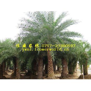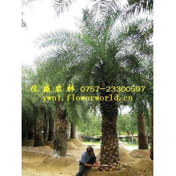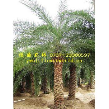 中东海枣 别名:银海枣 科名:棕榈科刺葵属 学名:Phoenix sylvestris 原产地:印度、缅甸 形态特征:银海枣植株高大雄伟,形态优美,树干粗壮,叶顶丛生,羽片密而伸展,大型羽状叶片向四方开张,形态如苏铁,使其成为最具观赏价值的羽状叶棕榈植物。干上残余叶柄伏贴干上,高可达10公尺,径为30公分,褐色,残余叶柄灰褐色,无叶鞘假茎,叶柄基部的棕蓑少少复叶基部的小叶变成针刺,羽状复叶较密,长约2-3公尺,果实指头大小。 生活习性:是一种耐高温、耐水淹、耐干旱、耐盐碱、耐霜冻(能抵抗-10℃的严寒,除东北和大西北冬天极严寒地域外),喜阳光,可在热带至亚热带气候下种植的棕榈科植物。栽培土壤要求不严,但以土质肥沃、排水良好的有机壤土最佳。银海枣生长快速, 各地均能引种,也是优良的室内植物。 种植用途:可孤植作景观树,或列植为行道树,也可三五群植造景,相当壮观,是充满贵族派的棕榈植物。应用于住宅小区、道路绿化,庭院、公园造景等效果极佳,为优美的热带风光树。