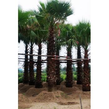 盛顿棕榈 (Washingtonia filifera)丝葵属,别名: 加州蒲葵、老人葵。原产于美国的加利福尼亚州、来利桑那州以及墨西哥等地。树冠优美,叶大如扇,生长迅速,四季常青,是热带、亚热带地区重要的绿化树种。尤其是那干枯的叶子下垂下覆盖于茎干之上形似裙子,而叶裂片间特有的白色纤维丝,犹如老翁的白发,奇特有趣。宜孤植于庭院之中观赏或列于植于大型建筑物前及道中两旁,是极好的绿化树种。