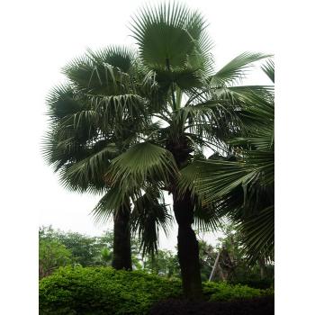 华盛顿棕榈 (Washingtonia filifera)丝葵属,别名: 加州蒲葵、老人葵。原产于美国的加利福尼亚州、来利桑那州以及墨西哥等地。树冠优美,叶大如扇,生长迅速,四季常青,是热带、亚热带地区重要的绿化树种。尤其是那干枯的叶子下垂下覆盖于茎干之上形似裙子,而叶裂片间特有的白色纤维丝,犹如老翁的白发,奇特有趣。宜孤植于庭院之中观赏或列于植于大型建筑物前及道中两旁,是极好的绿化树种。