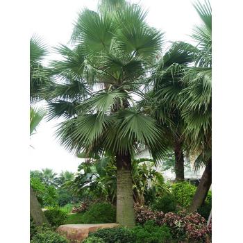 华盛顿棕榈 (Washingtonia filifera)丝葵属,别名: 加州蒲葵、老人葵。原产于美国的加利福尼亚州、来利桑那州以及墨西哥等地。树冠优美,叶大如扇,生长迅速,四季常青,是热带、亚热带地区重要的绿化树种。尤其是那干枯的叶子下垂下覆盖于茎干之上形似裙子,而叶裂片间特有的白色纤维丝,犹如老翁的白发,奇特有趣。宜孤植于庭院之中观赏或列于植于大型建筑物前及道中两旁,是极好的绿化树种。