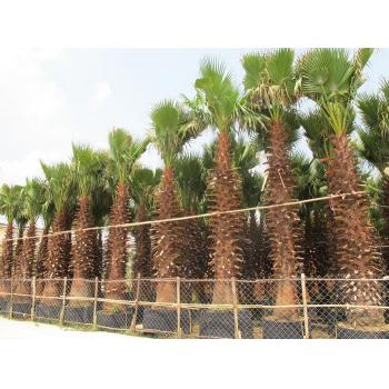 老人葵华盛顿棕榈 (Washingtonia filifera)丝葵属,别名: 加州蒲葵、老人葵。原产于美国的加利福尼亚州、来利桑那州以及墨西哥等地。树冠优美,叶大如扇,生长迅速,四季常青,是热带、亚热带地区重要的绿化树种。尤其是那干枯的叶子下垂下覆盖于茎干之上形似裙子,而叶裂片间特有的白色纤维丝,犹如老翁的白发,奇特有趣。宜孤植于庭院之中观赏或列于植于大型建筑物前及道中两旁,是极好的绿化树种。 目录 简介 养护技术 形态特征 生长习性 景观用途 适应地区 编辑本段简介 学名:Washingtonia filifera Wendl. 拉 丁 名: Washingtonia filifera 别名:老人葵,华盛顿葵 科属:棕榈科 属:丝葵属编辑本段养护技术 老人葵(2张)老人葵喜温暖、湿润、向阳的环境;较耐寒,在零下5°C的短暂低温下,不会造成冻害;较耐旱和耐贫瘠土壤,不宜在高温、高湿处栽培。福建汇百川园艺根据目前部分老人葵生长不良情况,现提出如下养护方案: 一、肥水管理:新根长出后,即要进行施肥,若不然,则新叶未抽出叶柄,叶片即开散,久之则叶黄甚至干枯。每株每次用量100-200克,以N-P-K为15-15-15的复合肥溶于水中后施于根际,不可直接施于新根上。生长季节每半月一次,同时,为保持有充足的养分供应,同时进行叶面喷肥处理,0.5%尿素或0.3%磷酸二氢钾或0.2%硝酸钾。喷至叶面滴水为度。一般在晴天下午4点左右进行,阴天可全天进行。也可用日本EM生物肥, 以1000倍进行叶面喷施,800倍进行灌根,可起到防病,促叶片生长和根系的生发。空气干燥时,进行叶面喷水,喷湿叶面即可,不可长时间喷雾,水量过大可引起病害,也可造成积水,具体情况须根据当时气温而定;浇水量保持基质湿润即可。 二、防病虫害:温暖湿润的条件下,老人葵生长迅速。刚移栽的老人葵,根系不发达,吸收养分的能力有限,而生长迅速,造成体内养分积累少,抗病虫害的能力差。病虫害易侵染,如虫害为含龟子、象甲虫,毛虫;病害:心腐烂、枯萎病等。由于组织柔嫩,虫害病害侵入快,发病重,须及时防治。一般以78%科博500-600倍,80%代森锰锌600倍进行防治病害,以50%辛硫磷或75%硫双灭多威进行虫害防治,具体操作时,可杀菌杀虫剂或叶面肥一起进行喷施,但须控制好浓度,避免高温进行,免受药害、肥害。针对已发生病虫害植株,使用150-300倍液虫线清进行灌芯。 三、针对欢乐海岸工地的种植土是回填土,土壤较容易板结,为防止土壤板结需进行中耕松土。