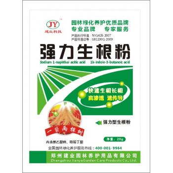 本品是一种新型、广谱、高效、低毒的植物生长调理剂,植物吸收后能迅速促进根部细胞分裂与扩大,强力诱导植物爆发式生根。在进行苗木扦插、移栽过程中快速生新根,提高扦插和移栽的成活率。本品具有传导和渗透性,叶面喷洒、蘸根、灌根等多种使用方式。可经叶片、根、茎的表皮进入到植物体内,在生长点起作用,起到根多、根长、根粗、根壮的目的,是园林绿化过程中不可缺少的生根产品。使用对象:苗木 花卉 果树 蔬菜使用方法: 扦插育苗:1.浸根:将本品每袋兑水10公斤,将苗木根系或插条浸于溶液中1-3个小时即可用于扦插 2.喷根:将本品每袋兑水15公斤,用喷雾器将苗木根系全部喷湿即可。 3.蘸根:将本品每袋兑水2公斤,将苗木根部或插条在溶液浸蘸20-30秒钟即可扦插. 大树、灌木移栽:灌根时,每袋稀释1200-1500倍,在苗木移栽时进行根部浇灌,胸径10公分以下的苗木用量为2棵/袋,10公分以上的的树木用量为1棵/袋。注意事项: 1、 如有少量物质不溶于水属正常现象,不影响使用效果。 2、 不宜与其他碱性农药混用,勿食用。生产日期:见封口 保质期:两年电话:0371-62121660 18638520795 联系人:王先生 传真:0371-62121660 地址:郑州市新区工业园区 E-mail:zzswkj@126.com QQ:1499355587 网址:www.zzswkj.com