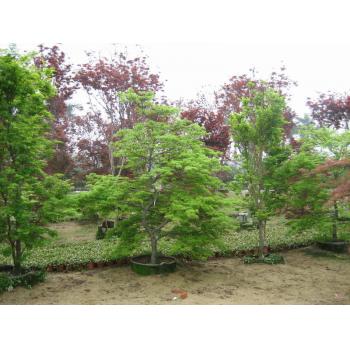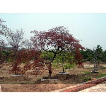 日本红枫,别名:日本红丝带。 产地分布:从日本、韩国到中国。 形态特征:掌状5-7深裂,卵状披针形,此品种在春、夏、秋三季叶片均为红色,尤其春秋;季节叶色为鲜红色,仲夏叶片变为棕红色。被誉为\\\\\\\"四季火焰枫\\\\\\\"。冬季叶片落尽后,它奇特极富观赏性的枝干仍然为冬季园林增添一景。 生长习性:适合与寒冷气候,喜营养丰富且排水良好的肥沃土。 园林用途:园林造景,庭院绿化。 栽培品种:日本红枫栽培历史悠久,现已经培育出众多的栽培品种:‘红舞妓’、‘桂’、‘舞孔雀’、‘紫秀’、‘稻叶垂枝’、‘橙之梦’、‘绯红皇后’、‘金色满月’、‘红镜’等都是非常著名的品种。 繁殖培育: 种子繁殖。 栽培品种需要嫁接方式繁殖。