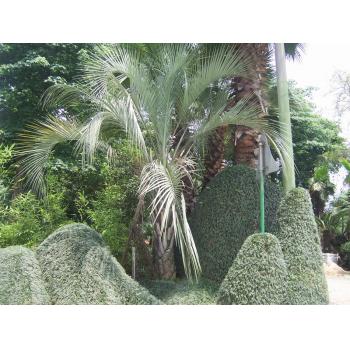 布迪椰子 [棕榈科] [椰子属] 别 名:冻子椰子 拉丁名:Butia capitata (Mart.) Becc 产地分布: 巴西南部及乌拉圭。我国南方各省有引种栽培,表现良好。 形态特征: 单干型。株高7-8米。 茎干:灰色,粗壮,平滑,但有老叶痕。 叶片:最典型的羽状叶,长约2米,叶柄明显弯曲下垂,叶柄具刺,叶片蓝绿色。 花序:源于下层的叶腋,逐渐往上层叶腋生长。 果实: 椭圆形,长2.5厘米,黄至红色,肉甜。 种子:18毫米(3/4英寸)长,椭圆,一端是三个芽孔。 生长习性: 喜阳光,是抗冻性最强的棕榈植物之一,布迪椰子的气候适应范围较广,从亚热带至温带,并能耐严寒,可耐-22℃干冷两周之久。适合海滨地区以及干旱地区种植。 对土壤要求不严,但在土质疏松的壤土中生长最好。 园林用途: 优美的株形是其主要的观赏特征,是理想的行道树及庭园树,而且它的果实还可提取果酱和果冻。 布迪椰子形太优美,可广泛种植于热带、亚热带及温带地区,是一种极受欢迎的园林绿化,盆栽树种,其果实可食,在原产地常将其加工成果冻食用。