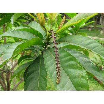 穗花棋盘脚树 名称 : 穗花棋盘脚树 别称 : 水茄苳、细叶棋盘脚、水木贡仔 学名 : Brringtonia racemosa 分布 : 广分布于热带亚洲的海滨地区,台湾分布于恒春半岛以及北部海滨 分类 : 玉蕊科 型态 : 叶呈倒披针形,叶缘前端渐尖、呈波浪状或齿牙状锯齿,叶柄为紫红色;总状花序由顶生的叶腋悬垂,长约80~90公分,花为乳白色,直径约3~4公分,雄蕊为淡红色,每到了夜晚才开花,像成串倒挂的吊灯闪耀且明亮动人,但第二天清晨就会掉落,花有浓烈气味,主要靠夜间活动的昆虫传粉;果实呈长卵形,约5~7公分,果皮富含纤维质具有浮水性,所以可藉水流传播繁衍。 用途 : 是属于观赏和防风定砂的植物 花期 : 7月~9月间 有毒部位:叶、树皮与根含有氢氰酸以及皂素。 中毒症状:误食会引起肠胃不适、腹泻、动作不协调以及肌肉麻痹等现象。
