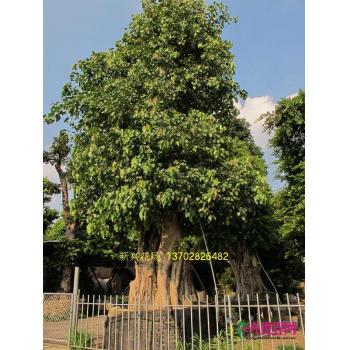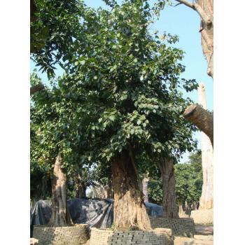 菩提榕 拉丁名:Ficus religiosa 科属:桑科榕属 形态:菩提树树型优美,枝干长有气生根,树干凸凹不平,给人以老态龙钟而又苍劲之感觉。侧枝多,广展,叶互生、全缘,心形或卵圆形,先端长尾尖,叶色深绿,枝叶扶疏,浓荫盖地,适作寺院,道路栽植。叶型美,叶脉细致,寺院僧人常采其叶经浸泡冲洗处理,剩下叶脉如真丝织成的轻纱,用以绘制佛像、做竹笠、灯帷,书签 由来:菩提树(Ficus religiosa),别名菩提榕,为桑科榕属落叶或半落叶大乔木。\"菩担\"是佛教名词,是梵文Bodhi的译章,意为\"觉悟\"。菩提树的原名毕钵罗树,传说佛教始祖释迦牟尼在29岁时离别双亲、妻儿,出家修佛,经过7年冥思苦想,最终在一株毕钵罗树下\"大彻大悟\"而成\"佛\"的。因此,毕钵罗树改叫菩提树,被佛家尊为神圣的树木,与娑罗树、阎浮树一起被称为佛门三宝树。