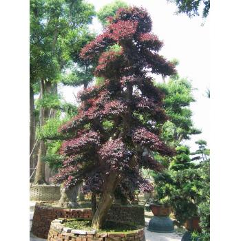 红花继木盆景介绍 红花继木原产湖南浏阳,宁都一带,它是在特定的外界条件下,从金缕梅科继木属分离出来的一个自然杂交变种。叶常年紫红色,花红色。花期一般在2月底至4月初,这个花期一般称为正造花期,这个时候的花期长,花最多,整棵树见花不见叶,时间可持续1个多月。天气暖和少雨,它就早开花,如天气寒冷和多雨水,它就迟开花。在南方大部分地区一年四季都能开化,但除了正造花期外,其它时间的花相对较少,时间较短,大约在15天左右。红花继木喜温暖向阳的环境和肥沃湿润的微酸性疏松土壤,耐寒、耐修剪,易生长。 红花继木是在上世纪八九十年代才真正大量繁植生产,因它的叶红,花红,树形优美,枝繁叶茂,性状稳定,适应性强,而大量用于绿化环境,美化公园、庭院,观赏价值极高,成为最近几年来园林造型应用最广的彩色树种之一。 红花继木盆景的养护管理 红花继木的养护管理主要体现在淋水 、施肥 、摘芽 、换泥 、病虫害的防治等几个方面。只要做好这几方面的工作,就可以保持红花继木盆景的正常生长,既能够保持它的优美造型,又能够防止枝条的枯死 。 淋水:红花继木需要充足的水份,因其叶面的毛孔较粗,容易蒸发水份,所以在夏季的淋水要充足,上盆的一天可淋水2—3次,地上的1次;如果刚上盆或刚移种的每天要向树干和枝叶喷水多次,使其保持湿润;其它季节视天气情况,泥土的湿润情况进行淋水。 施肥:红花继木也受肥,一般可用饼肥沤透(约3个月)稀释10—20倍以上施用,春末、初夏和秋季每月施1—2次,视树的生长和成熟程度而定。除饼肥之外,也可施用化肥,但要根据说明适当施用,切勿施肥过多,造成不必要的损失 。 摘芽:红花继木的萌发力非常强,每当春季到来之时、或修剪之后,枝干都会萌发出许多嫩芽,在这个时候,必须将多余无用的芽头摘去,以免影响枝条的正常生长,防止枝条因阳光不足、营养不足、不通风、不透气而枯死,影响整株的观赏价值和经济价值 。 换泥:换泥也就讲的翻盆,红花继木的根系非常发达,如果上盆多年不换泥,枝条就可能慢慢缩枝、枯死,树生长不旺盛,容易造成半边或整株死亡。所以上盆的红花继木一般在2年换一次泥,换泥最好在2-3月底进行。换泥前一段时间应停止淋水和施肥,待盆土干后,将树带泥从盆中脱出,除去一半或2/3的旧泥,剪去烂根、部份老根和须根,在盆底垫上一层粗粒土,以便疏水透气。将树种回盆中,放入新土(配制好的混合土)淋透水,然后保持盆土不干不湿,以便生根发芽。 病虫害的防治:红花继木的病虫害相对较少,主要有根腐病,白粉病等,可用45%硫酮悬浮剂、多菌灵、托布津等药物防治。虫害主要有:蚧壳虫、红蜘蛛、蚜虫、金龟等,可用脱蚧、杀蚧净、爱杀螨、敌百虫等农药防治杀灭。 红花继木盆景的素材来源 红花继木盆景绝大部份是用野生白花继木嫁接而成,因为红花继木真正繁植的时间很短,所以用作盆景的资源不多,而红花继木同白花继木同继木属。白花继木生长在荒山脊土,长年樵伐火焚,树头伤残矮缩,日久年深而形成千姿百态,苍老古朴的老桩,用于嫁接红花继木实是上等素材。而红花继木盆景的资源就来源于挖掘野生的白花继木老桩稼接而成。 红花继木盆景的栽培制作 红花继木盆景坯桩大部份都是用白花继木嫁接而成的,基本上都生长1年以上的,根据不同的坯桩,不同的栽培环境,可选择在地上或者盆上栽培制作 。红花继木盆景坯桩如果栽培环境许可的情况下,一般最好种植在地上,由于红花继木喜爱阳光和湿润的酸性泥土,所以在地上栽培生长特别快,对盆景的成型时间大大缩短,加快了盆景的观赏和经济价值。 栽培的泥土