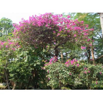 为常绿攀援状灌木。枝具刺、拱形下垂。单叶互生,卵形全缘或卵状披针形,被厚绒毛,顶端圆钝。花顶生,花很细,小,黄果树公园的三角梅黄绿色,其貌并不惊人,不为人注意,常三朵簇生于三枚较大的苞片内,花梗与药片中脉合生,苞片卵圆形,为主要观赏部位。苞片时状,有鲜红色、橙黄色、紫红色、乳白色等;从叶子又可分花叶和普通2类;苞片则有单瓣、重瓣之分;总此宝巾约有40余个不同的品种。苞片形似艳丽的花瓣,故名叶子花、三角花。冬春之际,姹紫嫣红的苞片展现,给人以奔放、热烈的感受,因此又得名贺春红。 “老鹰飞得高,兔子跑得快”,每一种动物的生存中都有它特长或精巧的一面。实际上,植物又何尝不是如此呢!赞比亚的国花三角梅便是这样。三角梅本是紫茉莉科中的一种藤状小灌木,又名叶子花、毛宝巾、九重葛,花叶勒杜鹃,它的花朵很小,又没有香味,按理说很难吸引蜜蜂或蝴蝶来为它传花授粉,但为了结果传承子嗣,大量繁衍后代,它有自己特别的“绝招”:将紧贴花瓣的苞片增大,并“染”上红、黄、白、橙红、红白相间等多种艳丽的色彩,使之酷似美丽的花瓣。这样,蜜蜂或蝴蝶就成了它的座上常客,从而解决了传宗接代的难题。 [编辑本段]生长习性 喜温暖湿润气候,不耐寒,在3℃以上才可安全越冬,15℃以上方可开花。喜充足光照。对土壤要求不严,在排水良好、含矿物质丰富的黏重壤土中生长良好、耐贫瘠、耐碱、耐干旱、忌积水,耐修剪。叶子花原产南美洲的巴西,大约在十九世纪三十年代才传到欧洲栽培,现在我国各地栽培。它喜温暖湿润、阳光充足的环境,不耐寒,我国除南方地区可露地栽培越冬,其它地区都需盆栽和温室栽培。土壤以排水良好的砂质壤土最为适宜。 叶子花常用扦插繁殖,育苗容易,五、六月份,剪取成熟的木质化枝条,长20厘米,插入砂盆中,盖上玻璃,保持湿润,一个月左右可生根,培养二年可开花。整株开花期很长,可达三、四个月。开花期间落花、落叶较多,需及时清除,保持清新美观。三叶梅属藤蔓生,繁殖简单。只需要在初春或者晚秋用它的茎杆扦插于土壤内,一个月就能生根,长出枝叶。第二年就能开花.它的花期很长,一般一月左右。叶子花花期较长,花多且美丽,在南方一般花期为当年的10月份至翌年的6月初。 [编辑本段]栽培技术 「培养土的选择」 叶子花对土壤要求不严,但怕积水,不耐涝,因此,必须选择疏松、排水良好的培养土。一般可选用腐殖土4份、园土4份、沙2份配制的培养土,也可使用晒干塘泥掺些煤饼渣作盆土。 「合理施肥」 要使叶子花多开花,必须保证充足的养分,同时施肥要适时适量,合理使用。一般4月至7月份生长旺期,每隔7天至10天施液肥一次,以促进植株生长健壮,肥料可用10%至20%腐熟豆饼、菜籽饼水或人粪水等。8月份开始,为了促使花蕾的孕育,施以磷肥为主的肥料,每10天施肥一次,可用20%的腐熟鸡鸭鸽粪和鱼杂等液肥。自10月份开始进入开花期,从此时起到11月中旬,每隔半个月需要施一次以磷肥为主的肥料,肥水浓度为30%至40%。以后每次开花后都要加施追肥一次,这样使叶子花在开花期不断得到养分补充。 「开花前要控水」 叶子花的平时浇水掌握“不干不浇,浇则要透”的原则。但要使叶子花开花整齐、多花,开花前必须进行控水。从9月份开始对叶子花的浇水进行控制,每次浇水要等到盆土干燥、枝叶软垂后方可进行,如此反复连续半个月时间,半个月后恢复平时正常浇水。控水期间切忌施肥,以免肥料烧伤根系。这样约一个月时间,叶子花即可显蕾开花,而且花开放整齐、繁盛。 「松土除草和换盆」 叶子花由于长期浇水、施肥和雨水冲刷,盆土容易板结,因此,必须定期松土,同时清除盆土杂草,以利于叶子花生长。否则盆土板结、积水,容易造成叶子花根系腐烂或生长不良。另外,叶子花生长速度较快,根系发达,须根甚多,每年需换盆一次。 「修剪要得当」 叶子花生长迅速,生长期要注意整形修剪,以促进侧枝生长,多生花枝。修剪次数一般为1次至3次,不宜过多,否则会影响开花次数。每次开花后,要及时清除残花,以减少养分消耗。花期过后要对过密枝条、内膛枝、徒长枝、弱势枝条进行疏剪,对其他枝条一般不修剪或只对枝头稍作修剪,不宜重剪,以缩短下一轮的生长期,促其早开花、多次开花。 三角梅「注意光照和通风」 叶子花是一种阳性植物,为了使枝叶生长正常,增加开花次数,必须把叶子花摆放在光线充足、通风良好的位置,让它每天光照8小时至12小时。如果摆放位置经常荫蔽,会使植株徒长,而减少开花数量。如果摆放位置不通风或盆与盆之间摆放过密,会使叶子脱落,特别是炎热夏天,忽热忽雨,容易造成大面积叶子脱落,从而影响植株的生长和开花。