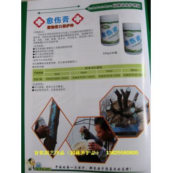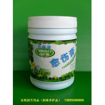 用于保护植物伤口,防止病虫侵害 [功能特点] 本品是采用优质原料结合先进工艺创制而成的植物伤口保护剂。其特有成分能迅速激活植物免疫系统,加强酚类代谢,消毒、杀菌、防腐,防水分、养分流失,促进伤口愈合,是植物健壮生长的保护神。 [适用范围] 苗木移栽时植物切口及根部损伤处理; 嫁接苗的伤口处理;树干皮层损伤处理; 病虫害引起的伤口。 [使用方法及使用量] 用毛刷蘸取适量愈伤膏,均匀涂布植物伤口。推荐使用量: 产品规格 树体伤口直径 5cm 10cm 15cm 20cm 愈伤膏500g 每瓶使用 每瓶使用 每瓶使用 每瓶使用 2000-4000处 500-1000处 220-450处 120-250处 愈伤膏800g 每瓶使用 每瓶使用 每瓶使用 每瓶使用 3200-6400处 800-1600处 350-700处 190-400处 [注意事项] 均匀涂抹,将伤口完全覆盖;每次使用完毕,注意加盖保存;贮于阴凉干燥处。 [净 含 量] 500g/ 瓶 800g/ 瓶 [有 效 期] 二年