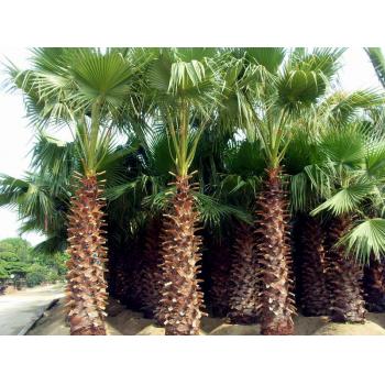 老人葵,别名:华棕,华盛顿葵。 生态分类:木本植物常绿乔木类。 观赏分类:荫木类。 高度范围:20 (M)。 形态特征:其干枯的叶子下垂,覆盖于茎干,叶片间一屡屡白丝状纤维,似老翁白发. 树干粗壮通直,近基部略膨大。树冠以下被以垂下的枯叶。叶簇生干顶,斜上或水平伸展,下方的下垂,灰绿色,掌状中裂,圆形或扇形折叠,边缘具有白色丝状纤维。肉穗花序,多分枝。花小,白色。核果椭圆形,熟时黑色。花期6-8月。 生长习性:喜温暖、湿润、向阳的环境。较耐寒,在-5度的短暂低温下,不会造成冻害。较耐旱和耐瘠薄土壤。不宜在高温、高湿处栽培。 景观用途:是美丽的风景树,干枯的叶子下垂覆盖于茎干似裙子,有人称之为“穿裙子树”,奇特有趣;叶裂片间具有白色纤维丝,似老翁的白发,又名“老人葵”。宜栽植于庭园观赏,也可作行道树。 这是棕榈科植物中较耐寒的种类之一,可耐-6℃的低温,抗风抗旱力均很强,生长迅速,树干直而挺拔,基部显著膨大,,粗壮而呈红褐色的树干格外引人注目。成年树高大雄伟,最高可达20m,头径50-90cm,树冠优美,叶大如扇,四季常青。掌状叶裂片间在幼时具白色的卷曲的丝状纤维, 能给人一种遐想万缕的感受。此品种遍植于美国加州的公路旁,差不多成为加州马路树的标志,有人称之为加州蒲葵,在公路两旁,由华盛顿葵构成的美丽景观会给驾乘人员一种愉悦的视觉享受,足以消除旅途疲劳。除了作为道路绿化树种外,被大量应用为园景树、行道树,或装点于立交桥畔、别墅宾馆。在公园、广场、河滨等较宽阔地带,孤植或群植,营造出绮丽多姿的热带、亚热带风光。 目前有几个房地产楼盘栽种上华盛顿葵后很有特色,提高了整个楼盘的景观档次,成都府南河畔种了大遍华盛顿葵表现良好,很受群众喜爱。四川温江荣星棕榈园有各种规格的华盛顿葵近两万株,从近六年的生长情况来看,表现优良,形状美观。成年华盛顿葵的叶裙长达10多米,能给人历尽沧桑、万古长青之感。作为绿化苗木生产,华盛顿葵极具市场潜力,它是目前绿化苗木中增值最快的树种之一。