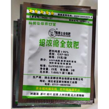 熊博士超浓缩全效肥使用方法 超浓缩全效肥,是一种将植物所需的十数种关键营养,浓缩到95%的纯度后,制成的功能性调节肥料。使用需要兑水稀释,兑水率1:600,即1袋肥兑1背水(15kg)。施肥方式是:叶面喷施、根部浇施、滴灌、淋灌均可,并可随酸性农药一起使用。对植物主要功能是:在不同生长期调节植物各系统平衡发育,促进根部与叶面光能转换系统协调,提高转换能力(就是用在一般的作物、植物上,使其光能转换系数达到1.5以上,超过袁院士超级稻的光能转换系数)。由此,在常规种植条件下,可确保增产10%以上, 50%一下。超浓缩为25g/袋装,35袋/盒,10盒/箱。由于本肥的功能调节性强,光能转换率高,繁根、茂叶等特色,在使用时请结合作物生长情况,按下方法操作: 1、作物、植物一季只能在育种期、育苗期、生殖生长期、孕育生长期四个阶段使用,即在常规施肥下,一季最多使用四次。 2、对获取茎叶类速生作物、植物,如茎、叶类蔬菜,摆花、插花、景观花,桑树,可7天喷施一次,茎、叶蔬菜不仅生长快速,还使茎、叶鲜、脆、嫩;花卉生长快速,娇艳,花期延长7天以上;桑树叶阔大鲜嫩。 3、对大树移栽,在移栽前,将大树根部浸泡在肥液中15分钟后包裹,运到移栽坑后,再浇施15kg肥液后掩土,7-15天见绿,100%成活率。 4、对所有作物、植物育种、育苗按下方法使用: 4.1浸种。浸种的作用一是用水选法将那些漂浮在水面的种子捞起来丢掉,只用沉在水底的好种子,确保发芽率;二是用浸种液杀灭种子附带的细菌;三是用浸种液给种子裹上一层养分,满足种子发芽后的营养需要。这三个作用经常被我们忽视,是我们低产、劣质的第一个原因。《熊博士》超浓缩全效肥(每包5元),具有杀菌和养分功能,不含激素。用一袋肥兑10公斤水,按各类种子常规方法用来浸泡1-2kg种子备用。 4.2 种田。种田只能用生田的土。把土晒干后粉成细末,再按10斤土兑一斤秸秆末的比率,将土与秸秆末拌均后,用浸泡了种子的肥液来拌土。把土拌成手捏成团,松开就散的程度后,将土按3-5厘米厚度,均匀的铺在早整好的的种田土基上,注意土基厚度要10厘米以上,土壤要松散后再薅平,浇施兑好水的超浓缩肥液,让土基自然融合3天后,再铺拌好的细土。 4.3 下种。 把细土铺好后,将种子点在种田里。点完后,再喷施1袋肥兑一背水的超浓缩肥液。喷好后,就等着种子发芽生长。 4.4 等种子发芽生长到两叶一心时,按肥1袋兑25公斤水的比率,喷施一次超浓缩全效肥。等到四叶一心时,再按上比率喷施一次超浓缩全效肥。注意不看见病虫害,不用农药及杀虫剂。 4.5 分苗。当苗长到4-6叶一心后就要分苗。分苗是将壮苗按一株一土移栽到中田,将弱苗丢掉。分苗时,注意不要损伤苗根。分苗移栽后,用另一种《熊博士》液体全效肥,200ml/瓶装的液体《全效肥》(每瓶12元)。用法是:肥1:水300,即1瓶200ml的肥兑60公斤水,当定根水浇施或喷施苗根部。分苗10天后,再按1瓶200ml全效肥兑40公斤水,根部喷施。 4.6 移栽。在田里取苗后,将苗根部浸在超浓缩肥液中5分钟(1袋兑15公斤水)后,再拿到大田按标准移栽,栽好后,用浸过根的超浓缩肥液,当定根水浇施根部,液不够就兑。一般移栽后的第七天苗就活了,成活率一般100%;第12天就长的生机盎然,苗子的颜色一般是墨绿色,黑的放亮。 5、对开花结果的作物、植物,按兑水率在生殖器、孕育期各喷施一次后,注意掐顶,掐底叶。因为光能转换率提高后的作物、植物生长旺盛,不掐顶就影响分枝,植株只往上长,光长的好看,不分枝而影响产量;不打底叶,哪些底叶就长的硕大厚实,影响了中层、上层叶营养需要,最终影响产量。用了超浓缩肥液的作物、植物,在同等气候条件下,生长期可增加30天以上,比如辣椒、苦瓜类可在长江流域长到11月中旬还果实累累。 6、解救僵苗。用了超浓缩肥液的没有僵苗,也少有病虫害,这是针对没有用的作物和植物出现僵苗后而说的。发现僵苗用超浓缩按1袋1背水喷施叶面或浇施根部一次,等7天僵苗缓解后,再喷施一次即可。两次喷施后,没有反映,说明出现了遗传性的重茬,马上拔掉苗子,改种其它作物、植物。 《熊博士》超浓缩全效肥,是国家发明专利,领先欧美肥料科技,理化指标优于欧美标准,是绿色、有机、生态等出口农产品首选肥料。在这里还很自信的说:请大家把自己所能收集到的肥料,包括进口的,还含什么激素的、氨基酸的、920的、海藻素的,只要是找得到的,都拿来在同等条件下,进行比较试验。不怕不识货,就怕货比货。只要一比就知道什么是超浓缩了。