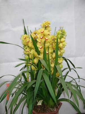 大花蕙兰又叫虎头兰、喜姆比兰和蝉兰。兰科、兰属植物。原产于印度、缅甸、泰国、越南和中国南部等地区的兰属(Cymbidium)中的一些附生性较强的大花种和主要以这些原种为亲本获得的人工杂交种。大花蕙兰,是对兰属中通过人工杂交培育出的、色泽艳丽、花朵硕大的品种的一个统称。兰属植物约48种,目前用来作杂交亲本的原生种有近20种,主要是大花的附生类以及少量的地生类。