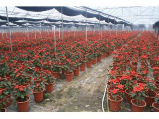 管理技术:一品红在我国南方可做露地栽培,北方作温室载培,但在5~9月间需充分接受光照,使植株得到充分的生长,而且日照长短是影响一品红开花的重要因素。一品红对肥料需求量高于唐菖蒲和香石竹,成龄植株通常在花芽分化前2周,对每株补充一茶匙氮、磷、钾为14:14:14树脂膜缓效肥,以补充可溶性肥料的不足,冬季肥料浓度应降低一半。一品红除在插条生根期间叶面喜水外,其他时间,叶面均以干燥为好。夏、秋摘心2~3次,疏除弱枝,月施液肥1次。如欲提前开花,可选枝条长20厘米的植株,缩短日照,每日9小时,经40天后可开化。越冬温度不低于5℃。