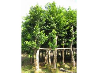形态特征:常绿乔木,高可达15m,树冠广展,树皮灰褐色,颇厚。多分枝,小枝近圆柱形或四棱形。叶对生,近革质,卵状长圆形或狭椭圆形,长11~17cm,宽4.5~7cm,叶色浅绿,两面多透明腺点。圆锥花序由多数聚伞花序组成,常生于无叶的老枝上,稀生于叶腋或顶生;花小。绿白色,有香味。浆果近球形,成熟时紫黑色,有斑点。