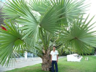 贝叶棕属棕榈科,是一种常绿乔木,原产亚洲热带,它通常树高20米左右,长得高大、雄伟,树干笔直,浑圆,没有枝丫,树冠象一把巨伞,叶片象手掌一样散开,给人一种庄重、充满活力的感觉,是热带地区绿化环境的优良树种。供观赏。叶宽大、坚实、柔韧,古印度用其叶刻经文,称“贝叶经”,保存数百年而不腐烂。多栽培于寺庙前,为小乘佛教礼仪树种。(本图成品树是样板图)。