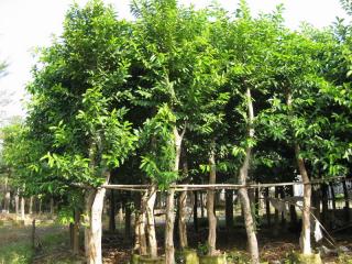 形态特征:常绿乔木,高可达15m,树冠广展,树皮灰褐色,颇厚。多分枝,小枝近圆柱形或四棱形。叶对生,近革质,卵状长圆形或狭椭圆形,长11~17cm,宽4.5~7cm,叶色浅绿,两面多透明腺点。圆锥花序由多数聚伞花序组成,常生于无叶的老枝上,稀生于叶腋或顶生;花小。绿白色,有香味。浆果近球形,成熟时紫黑色,有斑点。