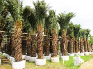中东海枣 别名:银海枣 科名:棕榈科刺葵属 学名:Phoenix sylvestris 原产地:印度、缅甸 生活环境:是一种耐高温、耐水淹、耐干旱、耐盐碱、耐霜冻(能抵抗-10℃的严寒,除东北和大西北冬天极严寒地域外),喜阳光,可在热带至亚热带气候下种植的棕榈科植物。栽培土壤要求不严,但以土质肥沃、排水良好的有机壤土最佳。银海枣生长快速, 各地均能引种,也是优良的室内植物。 形态特征:银海枣植株高大雄伟,形态优美,树干粗壮,叶顶丛生,羽片密而伸展,大型羽状叶片向四方开张,形态如苏铁,使其成为最具观赏价值的羽状叶棕榈植物。干上残余叶柄伏贴干上,高可达10公尺,径为30公分,褐色,残余叶柄灰褐色,无叶鞘假茎,叶柄基部的棕蓑少少复叶基部的小叶变成针刺,羽状复叶较密,长约2-3公尺,果实指头大小。 用途:可孤植作景观树,或列植为行道树,也可三五群植造景,相当壮观,是充满贵族派的棕榈植物。应用于住宅小区、道路绿化,庭院、公园造景等效果极佳,为优美的热带风光树。 海枣---阿拉伯人一日三餐或喝咖啡时常用的调味品.也是阿拉伯半岛的重要食品.历史上.曾被阿拉伯穆斯林商人称为"宰桐城"的我国福建省泉州市具有浓郁**特色的清静寺内就有两棵海枣树.清静寺在泉州历史上曾经是世界贸易港口的重要物证.寺内墙上的经文雕饰中有许多内容都是以祈祷真主保佑来华贸易的航海者为主题的.如[船舶在海中带着真主的恩惠而远行"等等.