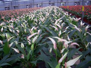 红掌是重要的热带切花,佛焰花序,其佛焰花苞硕大,肥厚具蜡质,色泽有红、粉、白、绿、双色等。其色泽鲜艳,造形奇特,应用范围广,经济价值高,是目前全球发展快、需求量较大的高档热带切花和盆栽花卉。