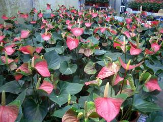 红掌是重要的热带切花,佛焰花序,其佛焰花苞硕大,肥厚具蜡质,色泽有红、粉、白、绿、双色等。其色泽鲜艳,造形奇特,应用范围广,经济价值高,是目前全球发展快、需求量较大的高档热带切花和盆栽花卉。