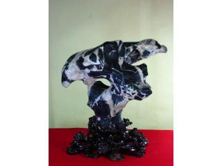产地: 广西 ,石种: 乌白腊石, 规格 (厘米) : 长:33 厚:24 高:31 此石采于广西省河流深处,长年经砂石水运作用,表面形成光滑孔洞,硬度7-7.5,质地脂润黑白相间,绝天然造化,似鸟空中飞翔寻找食物,体态优美栩栩如生,藏于1978年,纯古玩品味,不愧奇石之冠,历届获奖. 价格:980000