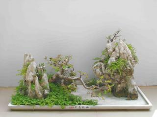 群山起伏,绿树成阴,溪涧流水,鸟语花香.真是人间仙景. 规格:盆100X50CM 电话:13602872918(QQ549702899 请到QQ空间观赏) 价格:13000