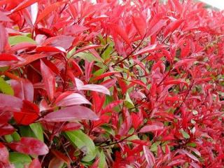 红叶石楠: 拉丁名:Photinia serrulata 别名:火焰红,千年红。蔷薇科石楠属,常绿灌木至小乔木,株高4-6米,叶革质,长椭圆形至倒卵披针形,先端具尾尖,春季新叶红艳,夏季转绿,秋、冬、春三季呈现红色,霜重色逾浓,低温色更佳。叶面腊质,周边有不规则小锯齿,顶端枝梢四季叶梗鲜红如火。做行道树,其杆立如火把;做绿篱,其状卧如火龙;修剪造景,形状可千姿百态,枝叶总红红火火,赏心悦目,景观效果美丽。 适宜地区:华北大部、华东、华南及西南各省区。 红叶石楠是蔷薇科石楠属杂交种的统称,为常绿小乔木,因其新梢和嫩叶鲜红而得名。常见的有红罗宾和红唇两个品种,其中红罗宾的叶色鲜艳夺目,观赏性更佳。春秋两季,红叶石楠的新梢和嫩叶火红,色彩艳丽持久,极具生机。在夏季高温时节,叶片转为亮绿色,在炎炎夏日中带来清新凉爽之感觉。红罗宾:叶缘锯齿比其他品种明显,个体差异比其他品种大。嫩叶2月下旬始发,随日照加强,春末叶色呈暗红色;嫩枝、新叶均呈鲜红色,直至5月中下旬。9月下旬秋叶萌发,再次呈鲜红色,与其他品种比,红叶期长。但比鲁宾斯短。叶片较大,12厘米~20厘米,叶片表面的角质层较厚,看起来特别光亮,但新叶较其他品种更容易焦叶。萌芽能力强,一年生枝条颜色红色,其生长速度较其他品种快,枝干粗壮,株形紧凑,耐修剪。花期4月~5月。耐最低温度为-12℃,适合在黄河以南的地区栽植。