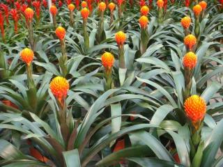当今常见的种类和品种,主要是属于凤梨科的珊瑚凤梨属(Aech-mea)、水塔花属(Billbergia)、果子蔓(Guzmania)、彩叶凤梨属(Neo-regelia)、铁兰属(Tillandsia)和莺歌属(Vriesea)这6个类群。它们以观花为主,也有观叶的种类,其中还有不少种类花叶并貌,既可观花又可观叶。