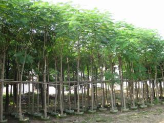 凤凰木,别名 :凤凰树、火树、红花楹、楹树、金凤花 【形态特征】 落叶大乔木,高10—20m,胸径可达1m。树形为广阔伞形,分枝多而开展。树皮粗糙,灰褐色。小枝常被短绒毛并有明显的皮孔。二回羽状复叶互生,长20—60cm,有羽片15—20对,对生;羽片长5—10cm,有小叶20—40对;小叶密生,细小,长椭圆形,全缘,顶端钝圆,基部歪斜,长4—8mm,宽2.5—3mm,薄纸质,叶面平滑且薄,青绿色,叶脉则仅中脉明显,两面被绢毛。冬天落叶时,多不胜数的小叶如雪花飘落。总状花序伞房状,顶生或腋生,长20—40cm。花大,直径7—15cm。花萼和花瓣皆5片。花瓣红色,下部四瓣平展,长约8cm,第五瓣直立,稍大,且有黄及白的斑点,雄蕊红色。花萼内侧深红色,外侧绿色。花期5—8月。荚果带状或微弯曲呈镰刀形,扁平,下垂,成熟后木质化,呈深褐色,长30—60cm,内含种子40—50粒。种子千粒重400g,种皮有斑纹。秋季(11月)果熟。和许多豆科植物一样,凤凰木的根部也有根瘤菌共生。为了适应多雨的气候,树干基部有板状根出现。为热带树种。喜高温多湿和阳光充足环境,生长适温20—30°C,不耐寒,冬季温度不低于5°C。以深厚肥沃、富含有机质的沙质壤土为宜;怕积水,排水须良好,较耐干旱;耐瘠薄土壤。浅根性,但根系发达,抗风能力强。抗空气污染。萌发力强,生长迅速。一般1年生高可达1.5—2m,2年生高可达3—4m,种植6—8年始花。在华南地区,每年2月初冬芽萌发,4—7月为生长高峰,7月下旬因气温过高,生长量下降,8月中下旬以后气温下降,生长加快,10月份后生长减慢,12月-翌年1月份落叶。应选土壤肥沃、深厚、排水良好且向阳处栽植。春季萌芽前与开花前应各施肥一次。台风季节应及时清理被吹断枝叶。病虫害有叶斑病和夜蛾幼虫等,须对症防治。 凤凰木主要用播种繁殖,春季4—5月播种,种子坚硬,须先用90°C热水浸种5~10分钟或用温水浸种一天,发芽率较高。播后一周可出芽。 【用途】 行道树:行道绿化树在夏季具有降温增湿的小气候效应,是绿化、美化和香化环境的风景树。 遮荫树:在盛夏7–8cm胸径的凤凰木最大冠幅可达8㎡–10㎡,其遮光率在50%–70%之间,凤凰木分枝较多,树冠中间与边缘相差不大,遮荫效果比较均匀且通风条件较好。树冠内相对温度比外界裸露处低3°C,最大低6°C。夏季栽植地一般维持在23-28℃左右,树冠内相对湿度比外界裸露地高10%—20%。 增肥改土:根系有固氮根瘤菌,可节省肥料的施用,凤凰木每年落叶量比较大,以胸径7–8cm的树木为例,每年落叶约3.1kg,大量的落叶为地被植物提供良好的覆盖物,起到保湿保温、改善土壤有机质含量和结构、增加土壤肥力。 木材利用: 其木质致密,质轻有弹性,可作为家具、板材、造纸原料。 凤凰树树冠高大,花期花红叶绿,满树如火,富丽堂皇,由于“叶如飞凰之羽,花若丹凤之冠”,故取名凤凰木。是著名的热带观赏树种。 凤凰木是非洲马达加斯加共和国的国树、中国广东汕头市的市花、福建厦门市、台湾台南市、四川攀枝花市的市树。