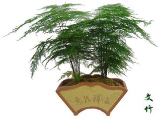 文竹是“文雅之竹”的意思。其实它不是竹,只因其叶片轻 柔,常年翠绿,枝干有节似竹,且姿态文雅潇洒,故名文竹。它 叶片纤细秀丽,密生如羽毛状,翠云层层,株形优雅,独具风韵, 深受人们的喜爱,是著名的室内观叶花卉。文竹的最佳观赏树龄 是1-3年生,此期间的植株枝叶繁茂,姿态完好。但即使只生长 数月的小植株,其数片错落生长的枝叶,亦可形成一组十分理想 的构图,形态亦十分优美。文竹可配以精致小型盆钵,置于茶几 书桌,或与山石相配而制作盆景。