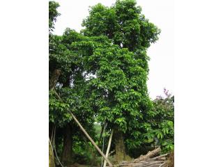 形态特征:常绿或半常绿乔木,高可达40米;树皮褐红色,光滑。三出复叶互生,小叶卵形或长椭圆形,长7-15厘米,先端渐尖,基部楔形,缘具粗钝锯齿(每厘米2-3个)圆锥花序下垂,雌花具3-4花柱;花期3-4月。果球形,径8-15毫米,熟时蓝黑色。
