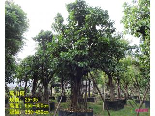 高山榕,桑科,属本地乡土树种,常绿大乔木,树高可达15米。叶长10-15厘米。春天,大的叶芽出现在枝梢,随后浅绿色的叶绽开,而此时不显眼的花苞片跌落满地。挂果如小小西红柿般大,由青绿变黄,成熟后变为红色的浆果,可食。特点是:生性强健,树姿丰满,能抵强风,移栽容易,适于作行道树、园景树和庭荫树。生长习性 高山榕 阳性,喜高温多湿气候,耐干旱瘠薄,抗风,抗大气污染。耐贫瘠和干旱,抗风和抗大气污染,生长迅速,移栽容易成活。 榕树属于热带树种,可能不太适合北京地区的冬季气候。榕树喜高温潮湿环境,夏季勤浇水,可生长良好,但在上海的冬季,由于室内一般无暖气,过冬始终是个问题。编辑本段形态特征 千年高山榕 常绿乔木,高可达30m,胸径90cm。树冠伞形,树皮灰色,平滑;幼嫩部分稍被微毛,顶芽被银白色毛,有少数气根。叶互生,厚革质,浓绿,广卵形至广卵状椭圆形,长10~18cm,宽7~10cm,顶端钝急尖,基部圆形或钝,全缘,两面无毛,基出脉3~5条,侧脉每边5~6条,明显。隐头花序成对腋生,雄花散生于花序内壁,具梗;雌花无梗,生于另一花序。瘦果表面有瘤状凸体。 少数气根,幼嫩部分被微毛,顶芽被银白色毛。叶互生,草质,卵形或广卵形,少数为卵状披针形,长7-27厘米,宽4-17厘米,顶端钝急尖或稍钝,基部圆形或钝,很少略为扁斜,全缘,光滑,基出3-5条脉,侧脉5-6对,较粗,网脉在背面较明显。花序单生或成对腋生,卵球形,长1.5—2.5厘米,宽1.5-2厘米,无总花序。编辑本段观赏应用 高山榕为桑科榕属的一种。高大乔木,树冠大;叶厚革质,有光泽;隐头花序形成的果成熟时金黄色。极好的城市绿化树种。树冠广阔,树姿稳键壮观。只是树体量太大,根系过于发达不太适宜作路树。非常适合用作园景树和遮荫树。又为优良的紫胶虫 寄主树。