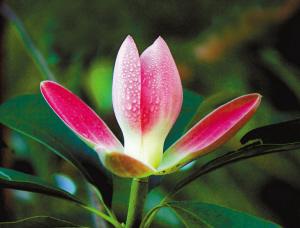 亮叶木莲 是常绿乔木,高达20m,胸径达65cm,花紫红色,花大艳丽而芳香,花期2-3月,果熟期7-8月。