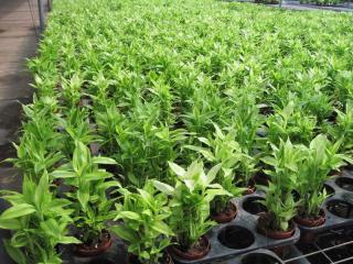 富贵竹又名叶仙龙血树,为百合科龙血树属观叶植物。原产加那群岛及非洲和亚洲的热带地区,20世纪80年代初,由中国热带农业科学研究院热带作物研究所引进于广东湛江。 富贵竹属常绿小乔木,茎干直立,株态玲珑,茎干粗壮,高达2米以上,叶长披针形,叶片浓绿,生长强健,水栽易活。其品种有绿叶、绿叶白边(称银边)、绿叶黄边(称金边)、绿叶银心(称银心)。绿叶富贵竹又称万年竹,其叶片浓绿色,长势旺,栽培较为广泛。一般多用于家庭瓶插或盆栽护养,特别是从台湾流传而来的“塔状”造型,又名“开运竹”,观赏价值高,颇受国际市场欢迎。 富贵竹粗生粗长,茎杆挺拔,叶色浓绿,冬夏长青,不论盘栽或剪取茎干瓶插或加工“开运竹”、“弯竹”,均显得疏挺高洁,茎叶纤秀,柔美优雅,姿态潇洒,富有竹韵,观赏价值特高。 富贵竹性喜阴湿高温,耐阴、耐涝,耐肥力强,抗寒力强;喜半荫的环境。适宜生长于排水良好的砂质土或半泥砂及冲积层粘土中,适宜生长温度为20—28℃,可耐2—3℃低温,但冬季要防霜冻。夏秋季高温多湿季节,对富贵竹生长十分有利,是其生长最佳时期。它对光照要求不严,适宜在明亮散射光下生长,光照过强、曝晒会引起叶片变黄、褪绿、生长慢等现象。所以在大田栽植,应搭1·7—1·8米高的遮阳网荫棚,以75%遮光率为宜,创造半阴阳、散射光照的环境。尤其是4—9月,要避免强光照直射,曝晒或过干旱,否则易使叶面粗糙,枯焦,生势弱,叶片缺乏光泽,降低观赏价值。在生长季节应经常保持土壤湿润,并常向叶面喷水或洒水,以增加空气的湿度;遇大雨应排清田间积水,以防倒伏。冬季要注意防寒、防霜冻,温度在10℃以下叶片会泛黄萎落。此时,土壤应干干湿湿为宜,但不宜干旱,也不宜过湿,要减少浇水和停止施肥。