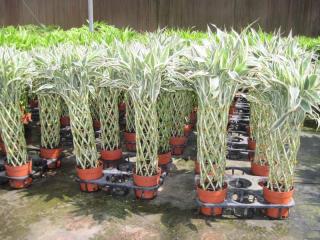富贵竹又名叶仙龙血树,为百合科龙血树属观叶植物。原产加那群岛及非洲和亚洲的热带地区,20世纪80年代初,由中国热带农业科学研究院热带作物研究所引进于广东湛江。 富贵竹属常绿小乔木,茎干直立,株态玲珑,茎干粗壮,高达2米以上,叶长披针形,叶片浓绿,生长强健,水栽易活。其品种有绿叶、绿叶白边(称银边)、绿叶黄边(称金边)、绿叶银心(称银心)。绿叶富贵竹又称万年竹,其叶片浓绿色,长势旺,栽培较为广泛。一般多用于家庭瓶插或盆栽护养,特别是从台湾流传而来的“塔状”造型,又名“开运竹”,观赏价值高,颇受国际市场欢迎。 富贵竹粗生粗长,茎杆挺拔,叶色浓绿,冬夏长青,不论盘栽或剪取茎干瓶插或加工“开运竹”、“弯竹”,均显得疏挺高洁,茎叶纤秀,柔美优雅,姿态潇洒,富有竹韵,观赏价值特高。 富贵竹性喜阴湿高温,耐阴、耐涝,耐肥力强,抗寒力强;喜半荫的环境。适宜生长于排水良好的砂质土或半泥砂及冲积层粘土中,适宜生长温度为20—28℃,可耐2—3℃低温,但冬季要防霜冻。夏秋季高温多湿季节,对富贵竹生长十分有利,是其生长最佳时期。它对光照要求不严,适宜在明亮散射光下生长,光照过强、曝晒会引起叶片变黄、褪绿、生长慢等现象。所以在大田栽植,应搭1·7—1·8米高的遮阳网荫棚,以75%遮光率为宜,创造半阴阳、散射光照的环境。尤其是4—9月,要避免强光照直射,曝晒或过干旱,否则易使叶面粗糙,枯焦,生势弱,叶片缺乏光泽,降低观赏价值。在生长季节应经常保持土壤湿润,并常向叶面喷水或洒水,以增加空气的湿度;遇大雨应排清田间积水,以防倒伏。冬季要注意防寒、防霜冻,温度在10℃以下叶片会泛黄萎落。此时,土壤应干干湿湿为宜,但不宜干旱,也不宜过湿,要减少浇水和停止施肥。