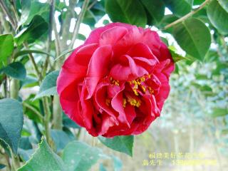 美国培育出来的品种,获伊尔格斯勋章奖,大到巨花,是少有的香型茶花之一,更是香茶花中少有的红花!为茶花中的极品:花径13-15厘米,艳红色,花型为牡丹型,或托桂型,花期1月至2月春节期间盛开,花期长。叶色浓绿,富有光泽,为盆栽和绿化之绝佳品种.克瑞墨大牡丹,不是牡丹,胜过牡丹!!