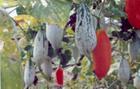 变色瓜也称彩瓜、金芒果瓜,因其两头小中间大,俗称其老鼠瓜,是葫芦科栝楼属一年生攀援性草本植物,原产印度、马来西亚一带,是一种非常新奇的瓜菜,特别适宜在科技园区和院种植,观赏食用兼得。变色瓜依瓜皮条纹分青皮白条和白皮青丝二种,根系特别发达,蔓长6-8米,生长势特别旺盛,叶深绿色,两面密生茸毛,掌状,叶脉放射状。雌雄同株异花,因此结瓜率特强,瓜形奇特,两头尖中段粗,瓜皮以白绿为主,间有绿色细条纹,果肉白色,单瓜重200-300克,嫩瓜食用味道好,炒菜或做汤,口味清香。留种成熟的种瓜色彩红艳,经久不落,非常美丽。变色瓜产量奇高,单株可结果200-300个,种上2-3株全家食之不尽,结果期长达4-5个月。变色瓜适应性强,对光照要求不严,耐高温,耐干旱,我国南北均可种植,每年2-6月均可播种,对土壤适应性很广,但以排水良好的沙壤土或粘壤土为宜。需搭高架棚种植,亩栽300株,亩产万斤以上,可自己留种。